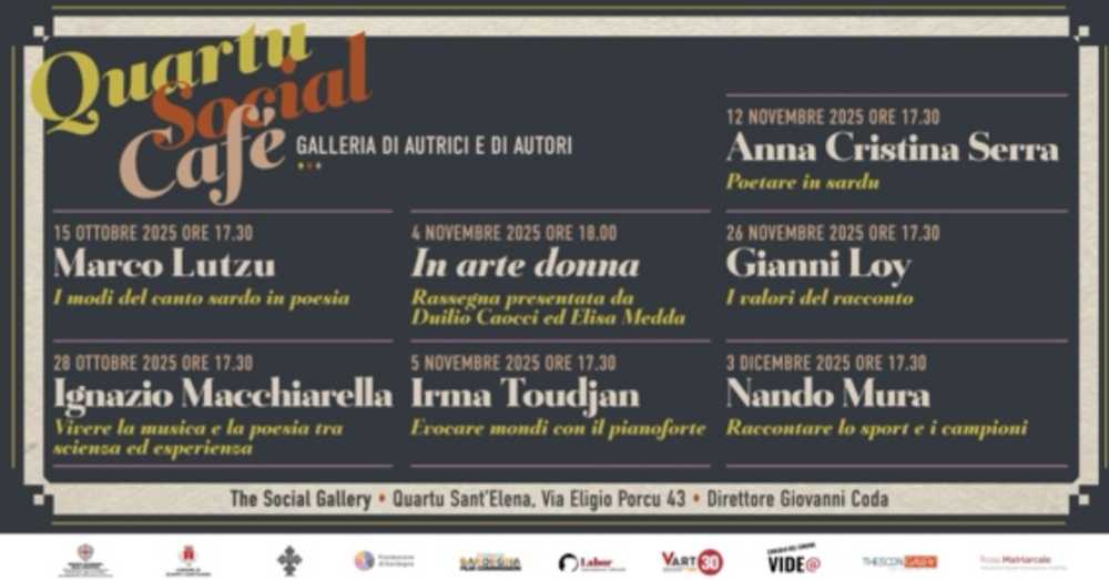 QUARTU SANT’ELENA. Il Quartu Social Café prosegue il suo ciclo di incontri dedicati ai protagonisti della cultura contemporanea con sette appuntamenti condotti da Duilio Caocci e organizzati dall’Associazione Rosa Matriarcale, con il sostegno del Comune di Quartu Sant’Elena e la collaborazione di The Social Gallery. Il programma, tra ottobre e dicembre, propone un percorso di dialogo tra letteratura, musica, poesia e arti visive, valorizzando le voci e le esperienze creative della Sardegna in un contesto aperto e partecipativo.