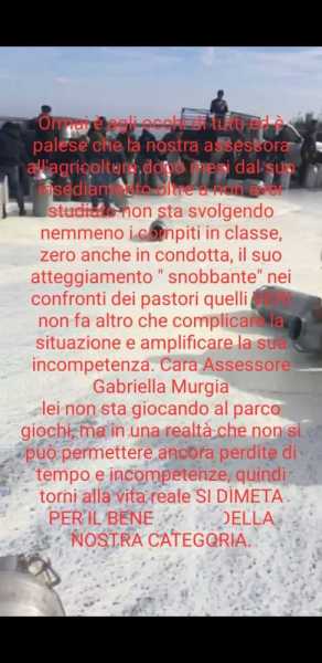 Quale che fosse l'esito dell'incontro, i pastori protagonisti delle principali proteste in Sardegna non hanno gradito le modalità. E sulla rete - via whatsapp e su facebook, canali principali di diffusione dei messaggi - ha iniziato a girare un messaggio: "Ormai è sotto gli occhi di tutti ed è palese che la nostra assessora all'Agricoltura dopo mesi dal suo insediamento, oltre a non aver studiato, non sta svolgendo nemmeno i compiti in classe. Zero anche in condotta, il suo atteggiamento "snobbante" nei confronti dei pastori, quelli veri, non fa altro che complicare la situazione e amplificare la sua incompetenza. Cara assessore Gabriella Murgia", sono le parole rivolte direttamente all'esponente della Giunta Solinas, "lei non sta giocando al parco giochi, ma in una realtà che non si può permettere ancora perdite di tempo e incompetenze. Quindi torni alla vita reale: si dimetta, per il bene della nostra categoria".