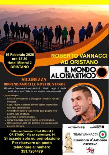 L’incontro si terrà domenica 16 febbraio 2026, alle 18.30, nella sala conferenze dell’Hotel Mistral 2, in via XX Settembre. L’evento è promosso dal movimento Il mondo al contrario e dal Team Vannacci – Eleonora d’Arborea Oristano. Il tema centrale sarà la sicurezza e l’iniziativa porta il titolo “Riprendiamoci le nostre strade”. L’accesso è consentito solo su prenotazione.