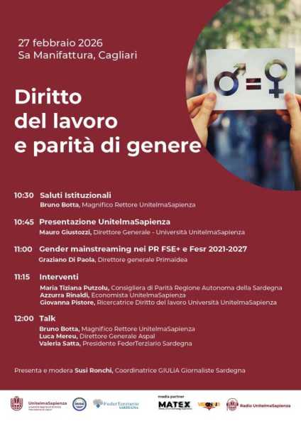 CAGLIARI. Il tema della parità di genere nel mondo del lavoro sarà al centro dell’incontro “Diritto del lavoro e parità di genere”, in programma venerdì 27 febbraio 2026 a partire dalle ore 10.30 presso Sa Manifattura, Polo didattico di Cagliari, promosso da UnitelmaSapienza – Università degli Studi di Roma in collaborazione con IEFCA – Istituto Europeo di Formazione, Cooperazione e Analisi Bioeconomica .