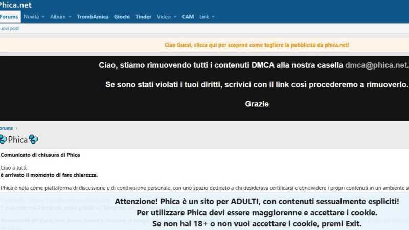 Nonostante gli sforzi, non siamo riusciti a bloccare in tempo tutti quei comportamenti tossici che hanno spinto Phica a diventare, agli occhi di molti, un posto dal quale distanziarsi piuttosto che sentirsi orgogliosi di far parte. Per questo, con grande dispiacere, abbiamo deciso di chiudere e cancellare definitivamente tutto ciò che è stato fatto di sbagliato."