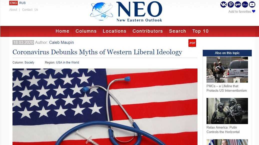 - La testata online Neo-Journal NEO (New Eastern Outlook viene considerata dall'Amministrazione Trump e dalla frangia conservatrice del Congresso USA uno strumento mediatico al servizio di Mosca. Il Neo-Journal da spazio ad una cronaca costante ospitando articoli e saggi di opinionisti, anche anonimi, che affrontano una narrativa abbastanza scomoda. Inoltre permette commenti liberi su temi divisivi e argomenti come la politica americana e le sue ingerenze geopolitiche con i governi di molti paesi orientali. Di recente il Neo-Journal si è distinto in particolare per alcuni articoli al vetriolo riguardanti le relazioni USA-Cina, le proteste a Hong Kong e le critiche agli attivisti democratici in Thailandia. Secondo fonti dell'intelligence USA alcuni redattori della testata, sono stati coinvolti nei tentativi di pilotare mediaticamente, con falsi account, campagne social e diffusione di fake-news, le campagne elettorali in Ukraina e Honduras o i movimenti di protesta in Thailandia.