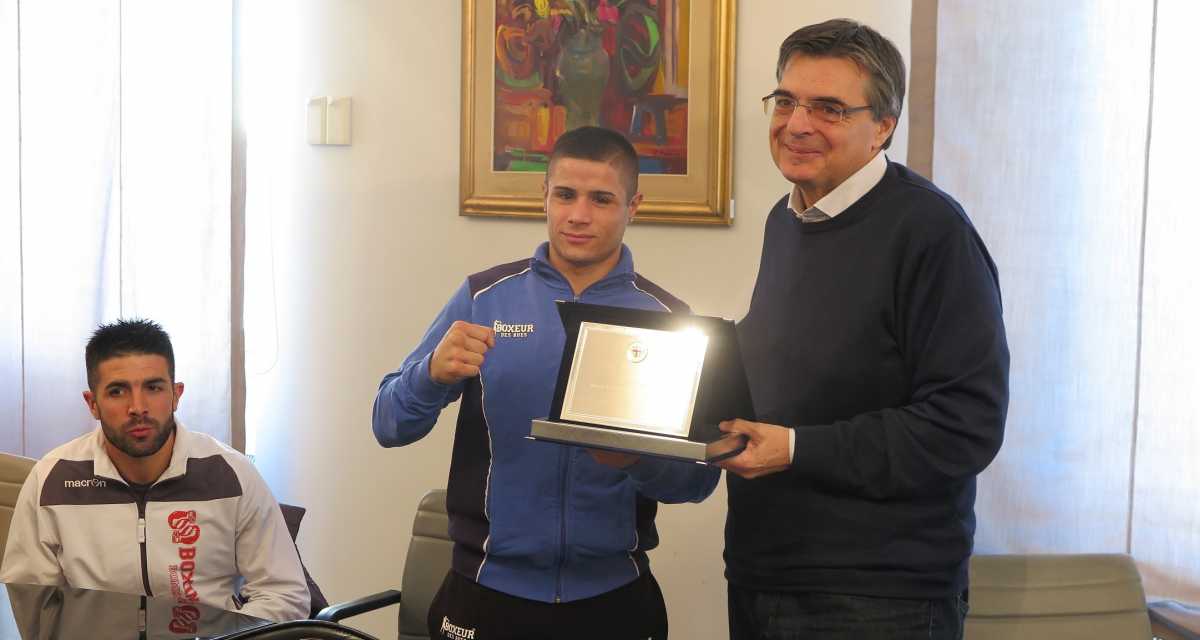 CAGLIARI. Il presidente del Consiglio regionale, Gianfranco Ganau ha ricevuto questa mattina a Sassari negli uffici della Regione, il giovane pugile sassarese, Federico Serra vincitore della medaglia d'oro nella categoria 49 chili ai Campionati Europei Èlite. L'incontro, aperto alla stampa, è stata l'occasione per consegnare al boxeur sardo, primo italiano a vincere i Campionati europei nella categoria minimosca, una targa della presidenza del Consiglio regionale della Sardegna, come riconoscimento da parte delle istituzioni sarde per lo straordinario traguardo raggiunto in soli quattro anni di carriera sportiva.