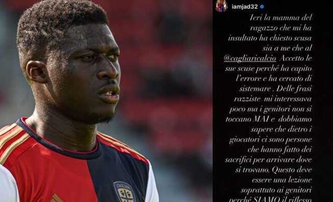CAGLIARI. Il centrocampista del Cagliari Alfred Duncan è stato vittima nelle scorse ore di insulti razzisti ricevuti sui social. Ma oggi, dopo aver denunciato il fatto nel suo profilo Instagram, decide di chiudere la storia e racconta che la mamma del ragazzo che lo ha insultato "ha chiesto scusa sia a me che al Cagliari". "Accetto le sue scuse - scrive il rossoblù - perché ha capito l'errore e ha cercato di sistemare. Delle frasi razziste mi interessava poco ma i genitori non si toccano mai e dobbiamo sapere che dietro i giocatori ci sono persone che hanno fatto dei sacrifici per arrivare dove si trovano. Questo deve essere una lezione soprattutto ai genitori perché siamo il riflesso dei nostri figli".