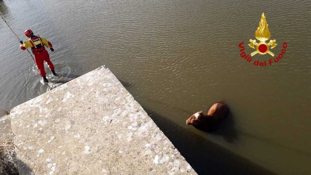 Carbonia, mucca cade in un invaso: salvata da un vigile del fuoco "cow boy"