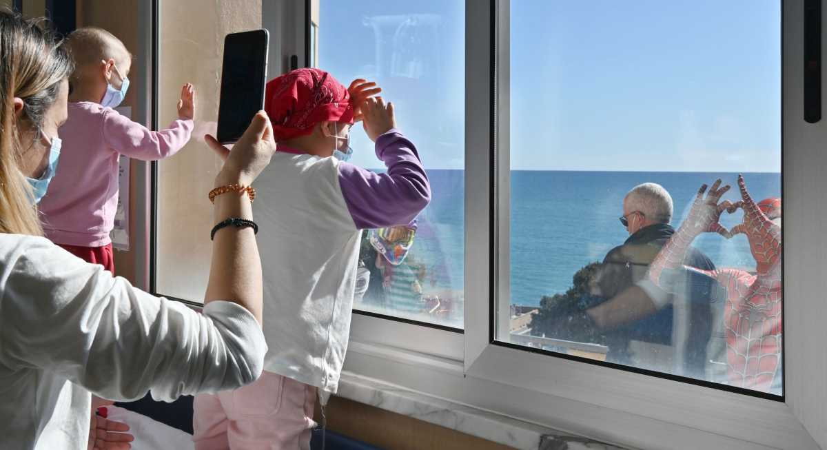 Una gru ha issato il motociclista Vanni Oddera, accompagnato dal suo collega motociclista Maurizio Gerini e Mattia Villardita nei panni del supereroe Spiderman davanti alle finestre dei reparti di Clinica pediatrica, Nefrologia, Ematologia e Oncologia.