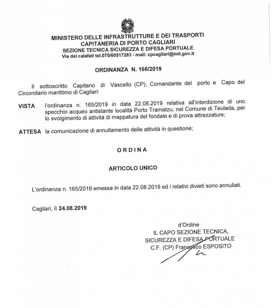 TEULADA. Dodici giorni di divieto di balneazione, transito e ormeggio nel mare di Porto Tramatzu. Sarebbe dovuta scattare da domani, domenica 25 agosto, l'ordinanza imposta nella spiaggia di Teulada dalla Capitaneria di porto di Cagliari per la "mappatura del fondale marino". In sostanza, nel documento si faceva riferimento alla possibilità della presenza di ordigni nelle acque di Porto Tramatzu, ragion per cui era necessario "vietare l'ancoraggio, la sosta e la navigazione, la balneazione e qualsiasi tipo di immersione fino al 5 settembre". Ma oggi arriva il dietrofront. I divieti sono stati annullati da una nuova ordinanza e i bagnanti, per ora, possono stare tranquilli.