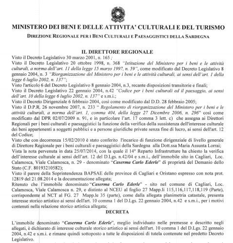 Ma qualunque operazione futura sull'immobile deve fare i conti con un documento ormai vecchio di tre anni, che non ha ricevuto alcuna pubblicità: il ministero dei Beni culturali l'11 settembre 2014 ha dichiarato la Caserma Ederle "bene di interesse storico, artistico e culturale". Ci ha messo il vincolo: significa che poco o niente ci si potrà fare. O quantomeno che le pastoie saranno strette. Molto strette. Il rischio è che vada a finire come la palazzina che ospitava gli alloggi degli ufficiali, lì davanti: passata alla Regione da 11 anni è murata e abbandonata. O quasi, visto che nel giardino qualcuno ha piazzato un tavolino, delle sedie e dei fiori: qualcuno se la gode. Non i cagliaritani.