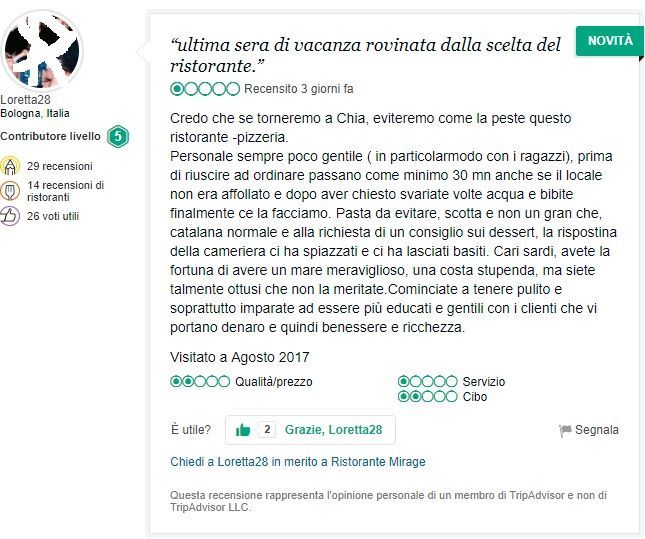 Donna, bolognese, che si lamenta del servizio in un ristorante di Chia. Arriva la lamentela sulla gentilezza del personale, e ci sta. Doglianza anche per l'efficienza e i tempi d'attesa. E ci sta anche questo. Poi: "Pasta da evitare, scotta e non un gran che, catalana normale e alla richiesta di un consiglio sui dessert, la rispostina della cameriera ci ha spiazzati e ci ha lasciati basiti". E fin qui si è ancora nella sfera dei giudizi personali su una situazione specifica, condivisibili o no che siano. Poi, ecco l'uscita: Cari sardi, avete la fortuna di avere un mare meraviglioso, una costa stupenda, ma siete talmente ottusi che non la meritate.Cominciate a tenere pulito e soprattutto imparate ad essere più educati e gentili con i clienti che vi portano denaro e quindi benessere e ricchezza". E questo no, non ci sta. Perché il livello è quello del turista che si era lamentato del mare isolano: c'erano troppi sardi, aveva scritto.