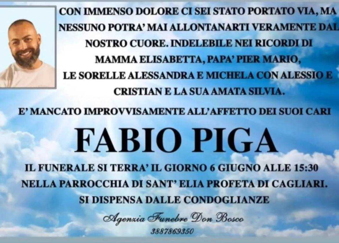 I funerali di Piga si terranno alle 15.30 nella parrocchia di Sant'Elia Profeta. "Con immenso dolore ci sei stato portato via", si legge nel necrologio dei familiari, "ma nessuno potrà mai allontanarti veramente dal nostro cuore".