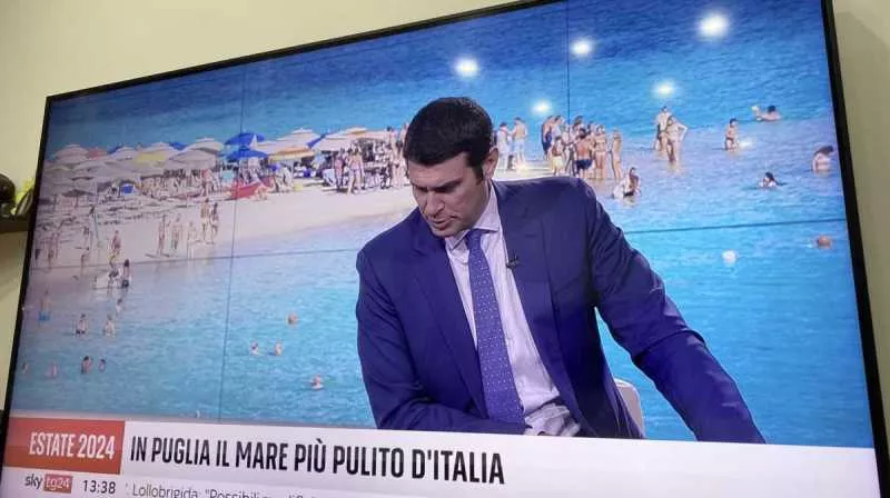 CAGLIARI. Il titolo è "Estate 2024: in Puglia il mare più pulito d'Italia", ma alle spalle del conduttore c'è una foto di Tuerredda. L'immagine diventata virale sui social è stata scattata e condivisa dal consigliere regionale del M55 Gianluca Mandas. Durante il telegiornale di SkyTg24 infatti si parlava dell'attività di monitoraggio del Snpa, il Sistema nazionale per la protezione dell’ambiente, che ha decretato la Puglia come regione con il mare più pulito.