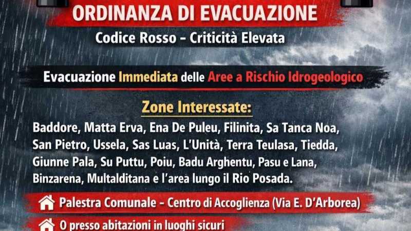 TORPÈ. Il comune di Torpè ha disposto un’ordinanza di evacuazione immediata per allerta meteo con codice rosso per criticità elevata legata al rischio idrogeologico. Il provvedimento riguarda le zone considerate a maggiore pericolo, dopo la chiusura di stamattina della 198 a causa della frana.