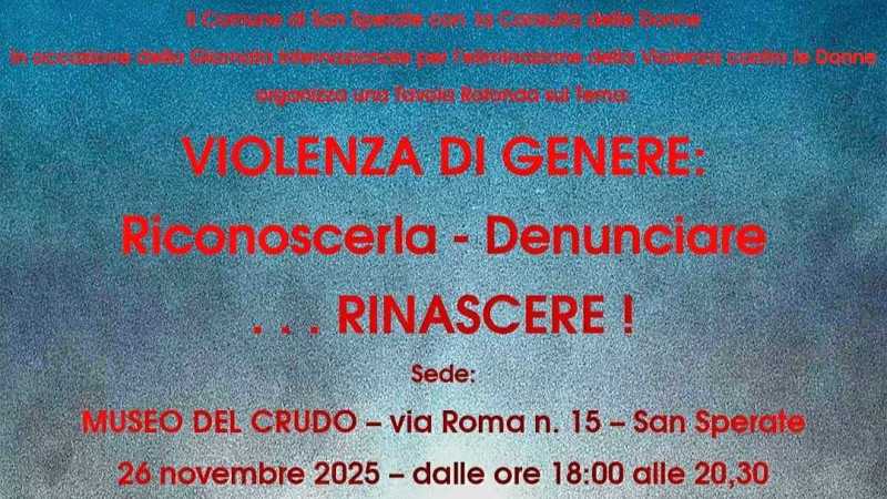 SAN SPERATE. Si terrà il 26 novembre 2025, dalle 18 alle 20.30, al Museo del Crudo di via Roma 15 a San Sperate, l’incontro pubblico dedicato al tema “Violenza di genere: riconoscerla – denunciare – rinascere”. L’appuntamento è organizzato dal Comune di San Sperate insieme alla Consulta delle donne, in occasione della Giornata internazionale per l’eliminazione della violenza contro le donne.