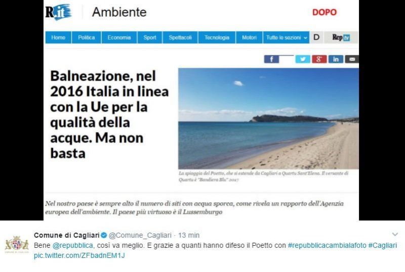 Una scelta scellerata, collegata all’articolo che riporta i dati dell’Agenzia europea per l’Ambiente. Tra tutte le brutture in giro per l’Italia è stata scelta la spiaggia dei cagliaritani. Che, peraltro, nella foto dimostra tutta la sua bellezza. La campagna è stata rilanciata anche dal profilo istituzionale twitter del Comune di Cagliari: "Associare quel titolo alla spiaggia di Cagliari è stata una pessima scelta". Ribadiamo anche noi: #repubblicacambialafoto.