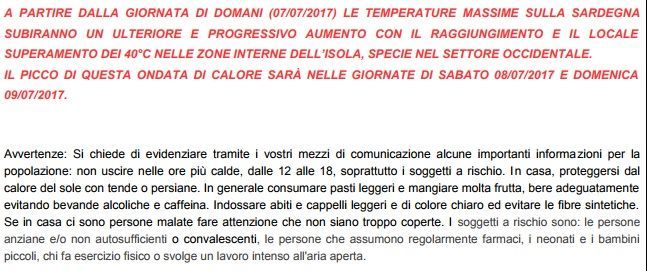 CLIMA. In Sardegna torna il caldo torrido. La protezione civile ha diramato un allerta meteo per alte temperature a partire dalle 12 del 7 luglio fino alle 18 del 9. Le temperature massime, si legge nel dispaccio, "subiranno un ulteriore e progressivo aumento" fino a superare i quaranta gradi, soprattutto nel centro Sardegna, specie nell'area occidentale. Il picco sarà fra sabato e domenica.