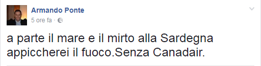 CAGLIARI. Che sia un fake o una persona realmente esistente, il suo post su Facebook ha sollevato un autentico polverone social. Lanciandosi in un commento decisamente poco elegante sulla Sardegna, Armando Ponte - avvocato romano cinquantenne, a leggere il suo profilo Fb - scrive: "A parte il mare e il mirto, alla Sardegna appiccherei il fuoco. Senza Canadair". Una frase offensiva che fa ancora più male all'indomani dei violentissimi roghi che hanno mandato letteralmente in fumo centinaia di ettari di vegetazione, da nord a sud dell'Isola. Immediata la reazione degli utenti (sardi, ma non solo) di Facebook.
