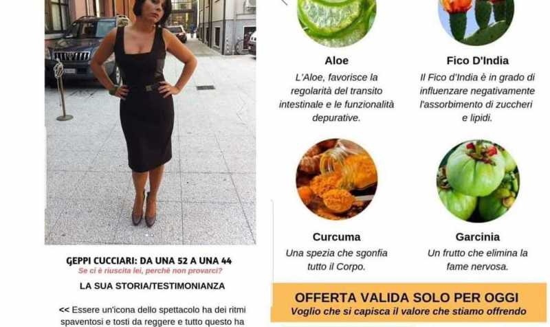 CAGLIARI. Non ha mai portato la taglia 54. E, soprattutto, non è il testimonial di quel prodotto che promette presunti miracoli per il dimagrimento. La showgirl sarda Geppi Cucciari è furente: nella pubblicità dell'Aloe Ferox viene usata la sua immagine e le vengono attribuite dichiarazioni che non ha mai pronunciato. "Lo ribadisco. Non si dimagrisce così. Non ho mai avuto la 54. Non ho mai preso Aloe Ferox. Non so che roba sia", accusa, "Questi disonesti usano le vostre fragilità per farvi comprare i loro prodotti. Si dimagrisce solo nei modi che già conoscete; mangiando con equilibrio e mantenendo uno stile di vita salubre. Questa gente merita di pagare per le loro cazzate, non voi. E sarà mia premura fare in modo che sia così".