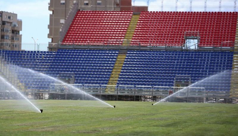 Uno degli ultimi step sta interessando la realizzazione del terreno di gioco, distante poco più di sette metri dagli spalti. Si è iniziato creando lo strato drenante inferiore del campo e predisponendo l’impianto di irrigazione. Una volta depositato l’humus ad alto grado di fertilità, sono stati srotolati i tappeti d’erba: ad oggi la metà dei circa 1.300 “rotoli” previsti per terminare l’opera. Il completamento è previsto per metà della settimana prossima: il tipo di erba usato è identico a quello del vecchio Sant’Elia.