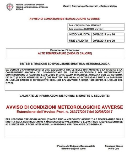 La Protezione Civile ha infatti diramato un avviso di condizioni meteo avverse per alte temperature. “Per i prossimi tre giorni le temperature sulla nostra Isola continueranno a mantenersi su valori molto elevati con il superamento dei 40 °C specie nelle zone interne della Sardegna meridionale e occidentale”, si legge nel comunicato. Ecco i consigli utili: non uscire nelle ore più calde, dalle 12 alle 18, soprattutto i soggetti a rischio. In casa, proteggersi dal calore del sole con tende o persiane. In generale consumare pasti leggeri e mangiare molta frutta, bere adeguatamente evitando bevande alcoliche e caffeina. Indossare abiti e cappelli leggeri e di colore chiaro ed evitare le fibre sintetiche. Se in casa ci sono persone malate fare attenzione che non siano troppo coperte.