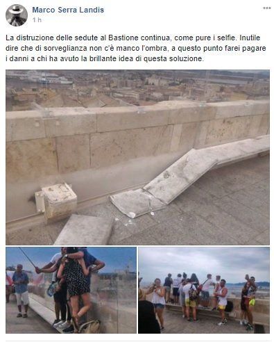 CAGLIARI. Distrutte, di nuovo. Ancora danni alle sedute del Bastione, le lastre di granito che sono state piazzate lungo il muro di Saint Remy. La denuncia arriva da Marco Serra Landis, nel gruppo Facebook "Parliamo di Cagliari", dove sono state pubblicate le immagini che dimostrano l'ennesimo scempio ai danni della terrazza che era rimasta chiusa per anni. Da quando è stata riaperta (alla fine di aprile) sono stati necessari continui interventi di ripristino degli arredi danneggiati. A pochi giorni dalla inaugurazione dopo il lavori a cedere era stata una seduta accanto alle gradinate del De Candia. Allora la causa era stato il peso eccessivo di un gruppo di turisti che erano saliti per fare un selfie. Ora come allora, un pezzo ricade, per le stesse ragioni. "Inutile dire che di sorveglianza non c'è manco l'ombra, a questo punto farei pagare i danni a chi ha avuto la brillante idea di questa soluzione", scrive chi ha pubblicato le immagini.