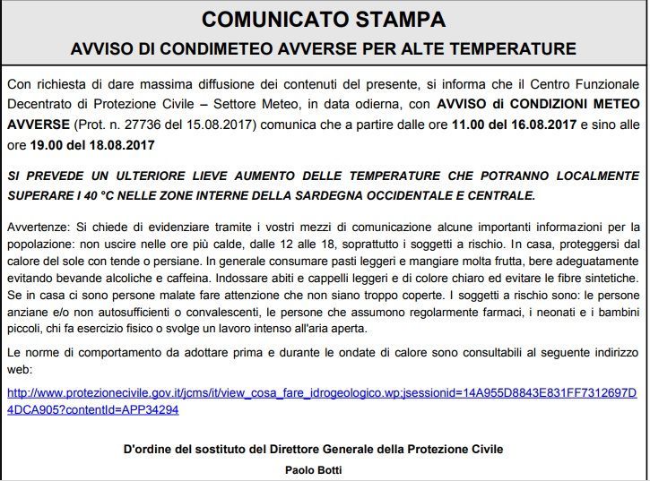 CAGLIARI. Farà caldo. A Ferragosto, in Sardegna, non ci sarebbe nemmeno di dirlo. Ma la Protezione civile ha diramato un bollettino di allerta meteo per alte temperature. Avviso di condizioni meteo avverse - si legge, e bisogna capire qual è il punto di vista: non certo quello di chi è al mare - dalle 11 di domani 16 agosto fino alle 19 del 18. Si prevede un ulteriore aumento delle temperature che in certe zone dell'Isola, soprattutto quelle centrali, potrebbero superare i 40 gradi. Immancabili i consigli: "Non uscire nelle ore più calde, dalle 12 alle 18, soprattutto per i soggetti a rischio. In casa, proteggersi dal calore del sole con tende o persiane. In generale consumare pasti leggeri e mangiare molta frutta, bere adeguatamente evitando bevande alcoliche e caffeina. Indossare abiti e cappelli leggeri e di colore chiaro ed evitare le fibre sintetiche. Se in casa ci sono persone malate fare attenzione che non siano troppo coperte. I soggetti a rischio sono: le persone anziane e/o non autosufficienti o convalescenti, le persone che assumono regolarmente farmaci, i neonati e i bambini piccoli, chi fa esercizio fisico o svolge un lavoro intenso all'aria aperta".