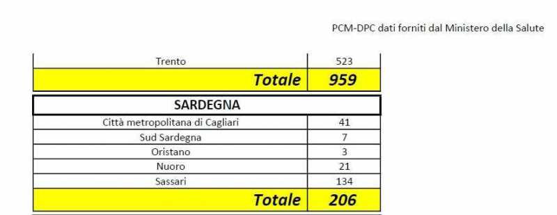 La distribuzione territoriale in Sardegna vede 41 casi di contagio nella Città metropolitana di Cagliari, 7 nel sud Sardegna, 3 a Oristano, 21 a Nuoro e 134 nella provincia di Sassari, dove ha dilagato il contagio soprattutto all'ospedale Santissima Annunziata e oggi è emersa la positività di 15 dipendenti del Giovanni Paolo II di Olbia (si tratta delle "vecchie" province)