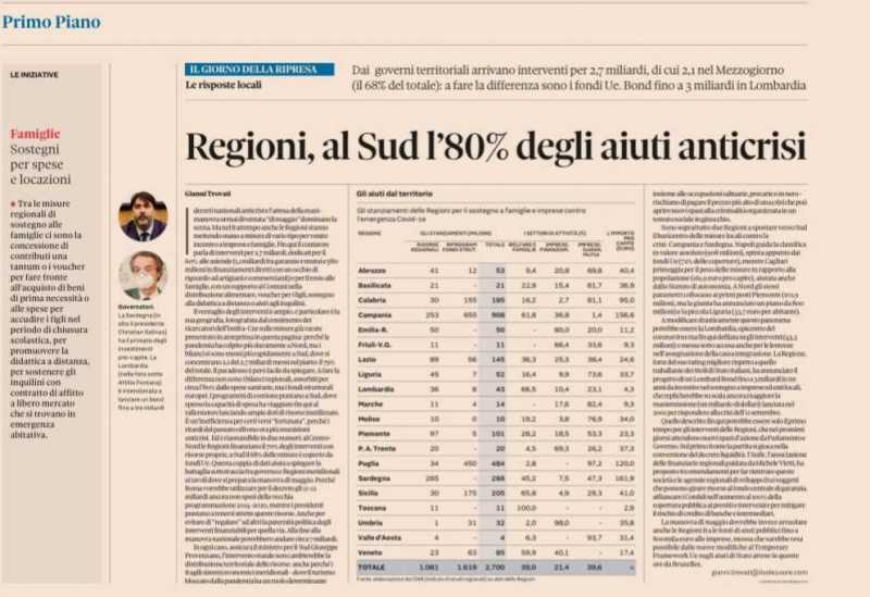 Il dato emerge da uno studio pubblicato da Il Sole 24 Ore sulla base delle ricerche dell’Istituto Issifra-Cnr (Istituto Studi sui Sistemi Regionali Federali e sulle Autonomie), che mette a confronto gli impegni finanziari delle Regioni Italiane, considerando quanto attinto dai propri bilanci e quanto frutto della rimodulazione dei fondi strutturali europei non ancora utilizzati. La Sardegna risulta prima in termini assoluti, con un impegno di 265 milioni di risorse proprie, al netto della rimodulazione dei fondi strutturali: una capacità di erogazione che quindi e’ suscettibile di un ampio margine di incremento. La Regione è prima anche nella classifica dei maggiori interventi messi in campo pro-capite.