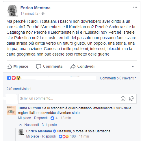 CAGLIARI. Tra le regioni italiane solo la Sardegna ha la patente per diventare stato indipendente. Parola di Enrico Mentana. Il direttore del Tg di La7 interviene con un post sulla rovente questione catalana con una riflessione a tutto tondo sull'indipendenza. Una questione storica e geopolitica sulla quale, a suo dire, non si possono fare figli e figliastri: "Ma perché - si chiede Mentana - i curdi, i catalani, i baschi non dovrebbero aver diritto a un loro stato? Perché l'Armenia sì e il Kurdistan no? Perché Andorra sì e la Catalogna no? Perché il Liechtenstein sì e l'Euskadi no? Perché Israele sì e Palestina no?". Immediati i commenti dei followers che - a rischio di essere "blastati" - in centinaia avanzano le loro domande: "Se lo standard è quello catalano - scrive Tuma Rillfrom - letteralmente il 90 per cento delle regioni italiane dovrebbe diventare stato". La risposta del direttore manda in visibilio i seguaci isolani della pagina: "Nessuna, o forse la sola Sardegna".