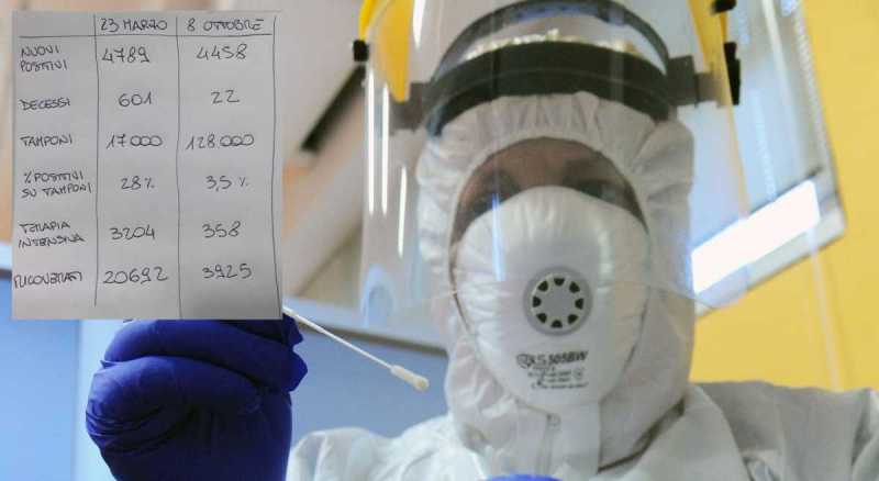 Il 23 marzo erano stati scoperti 20 nuovi contagi su 166 tamponi, con una percentuale di positività pari al 12% (ma il numero di tamponi era veramente molto basso), nei giorni successivi la media si attesta sul 3. In terapia intensiva c'erano 18 pazienti, si erano registrati tre decessi e in totale (compresi i gravi) c'erano 94 ricoverati. E ieri, 8 ottobre? I casi riscontrati sono stati 127 (25 i sintomatici, comunque superiori al dato di marzo), si è registrato un decesso, i letti in terapia intensiva occupati erano 19 e i ricoveri totali 148. Effettuati 2103 tamponi, con un incidenza dei positivi pari al 6,03%, quasi il doppio rispetto a marzo (salvo il giorno considerato).