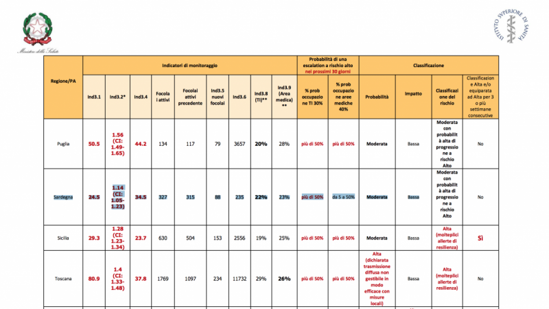 Ma l'Rt consente di tenere l'Isola ancora tra le regioni a fascia gialla, a classificazione "moderata con probabilità alta di progressione a rischio Alto", si legge nel quadro di sintesi nazionale. Tra gli indicatori ci sono anche le "allerte relative alla resilienza dei servizi sanitari territoriali": in Sardegna - si legge - è segnalata una "sola" allerta.