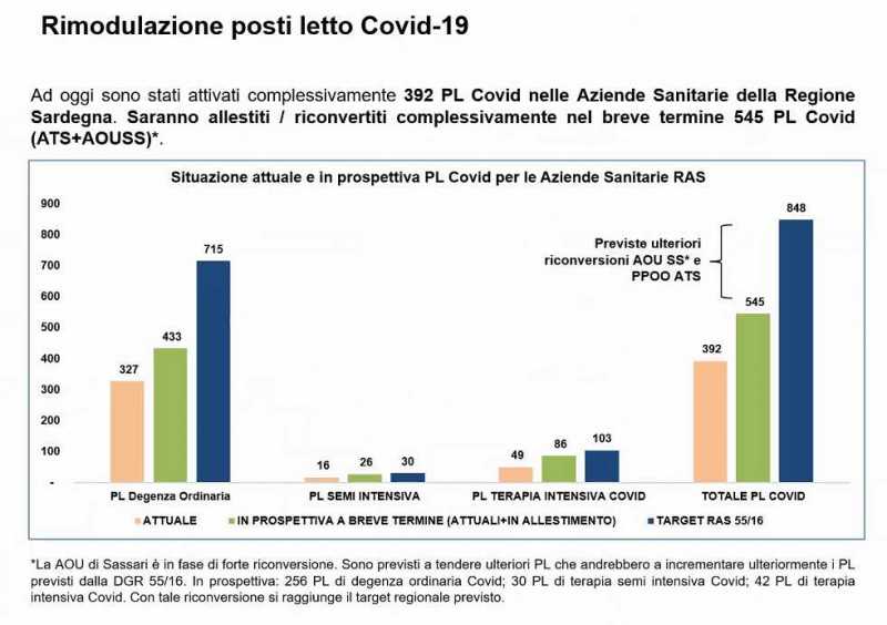 "Stiamo lavorando in sinergia con tutte le aziende ospedaliere della Sardegna", ha detto Temussi, "abbiamo individuato le criticità e le stiamo aggredendo. Dalla fase di gestione dei tamponi e dei loro risultati, fino a quella della cura del paziente sintomatico per arrivare al controllo di quelli asintomatici". Di seguito la slide sui posti letto.