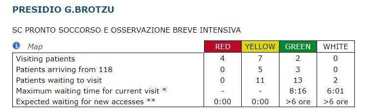 Stando al sistema di monitoraggio di Sardegna Salute al Brotzu risultano - poco dopo le 16 - 4 pazienti in codice rosso, 23 gialli, 18 verdi e addirittura due bianchi.