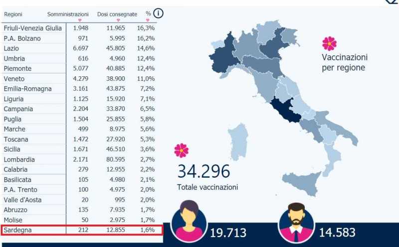 C'è, però, da accelerare. Secondo il report dell'autorità commissariale la Sardegna è ultima nella classifica delle regioni per la somministrazione del vaccino: sono state iniettate solo 212 sulle 12.855 a disposizione. L'1,6%, la percentuale più bassa d'Italia.
