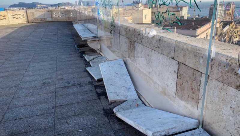 CAGLIARI. La terrazza del Bastione di nuovo vittima dei vandali. È l'ennesimo episodio: le panchine si spezzano in due e crollano probabilmente per il peso di chi ha provato a salire sopra con i piedi. Ma non solo. I pavimenti sono stati pasticciati con vernici o pietre. Questo lo scenario apparso stamattina ai cittadini che passavano di lì. A pubblicare le foto è Marcello Polastri, consigliere comunale di Cagliari, che scrive: "Spettacolo desolante, per via di quanti con idiozia scambiano come sfogatoio la terrazza sul tetto della città".