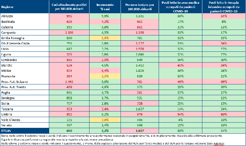 I casi attualmente positivi per 100.000 abitanti sono 858 contro i 893 della scorsa rilevazione, con una percentuale di incremento dei casi dell'1,7% (2,4% nella precedente).