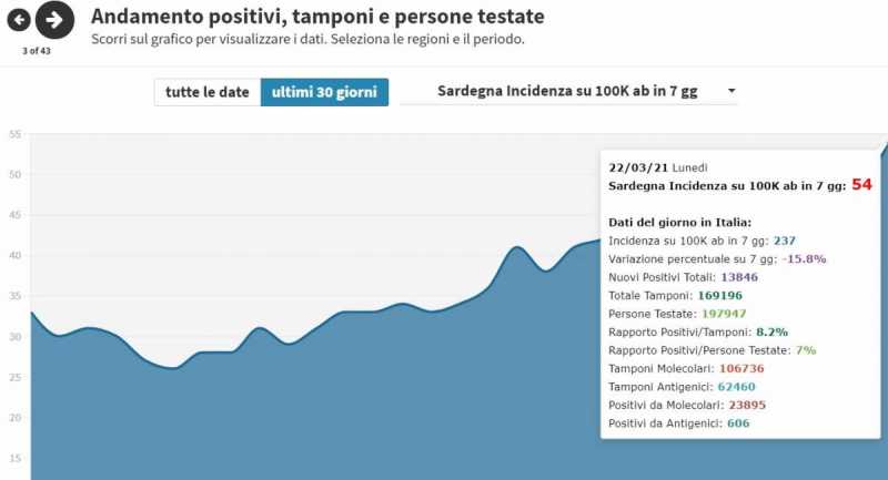 Ma il dato certifica la progressione costante della diffusione del virus nell'Isola, che nemmeno un mese fa, il 25 febbraio, contava 25 contagi ogni 100mila residenti. E ai fini del computo non pesa il fatto che i contagi accertati nell'ultimo bollettino siano emersi a seguito delle analisi su 14.175 tamponi, con un tasso di positività all'1 per cento. A essere preso in considerazione è solo il numero assoluto. Se questa tendenza non dovesse invertirsi, di eventuale ritorno in zona bianca non si potrà parlare prima della fine di aprile. Perché per abbandonare le restrizioni un territorio deve mantenere parametri al minimo per tre settimane di seguito.