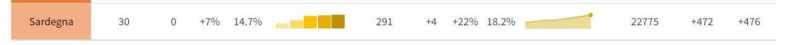 Secondo le tabelle ufficiali i letti occupati in area medica da pazienti contagiati sono 291, il 18,2% del totale. Meno pressione si registra solo in Molise, co il 10,8% (19 i ricoverati). Tutte le altre regioni sono messe molto peggio. La Valle d'Aosta è addirittura al 56,6% di saturazione. Discorso simile per le terapie intensive: la Sardegna è al 14,7%. Stanno meglio solo Basilicata, Umbria e Molise.