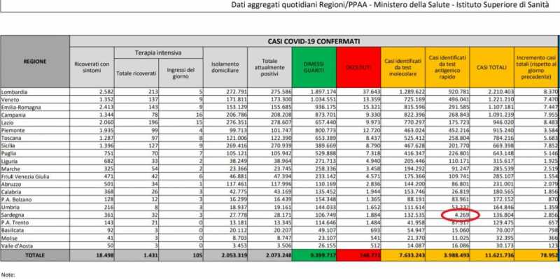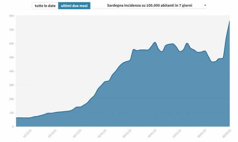 Il risultato è un drastico cambio dei numeri, che fa apparire la Sardegna come unica regione che si è infettata. Fino a venerdì risultavano appena 104 positivi emersi a seguito di antigenico rapido. Oggi sono ben 4.269: 4.165 in sole 48 ore, oltre 2mila al giorno. L'incidenza è salita a 763 nuovi positivi ogni 100mila abitanti nell'arco di sette giorni. Una forte crescita in controtendenza.