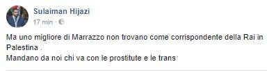 PALESTINA. "Ma uno migliore di Marrazzo non trovano come corrispondente della Rai in Palestina? Mandano da noi chi va con le prostitute e le trans". Sulaiman Hijazi è stato a lungo portavoce della comunità islamica di cagliari. È palestinese, difende la causa del suo popolo e le sue comunicazioni sono sempre state ponderate, nonostante la difficile situazione con Israele. Per questo ha destato scalpore il suo commento sul giornalista Rai Piero Marrazzo, inviato in questi giorni a Betlemme per raccontare le tensioni che sono seguite all'annuncio del presidente Usa Donald Trump su "Gerusalemme capitale d'Israele". Un'uscita che ha scatenato pesanti reazioni di protesta in Europa e in Medio Oriente, con tumulri di piazza, ma anche numerose manifestazioni di solidarietà con il popolo palestinese.