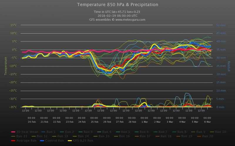 Quasi tutti i 20 spaghi che riportano la temperatura a 1500 metri sulla verticale di Milano virano dal 24 febbraio drasticamente verso il basso su valori attorno ai -12°C. Anche qui, secondo il modello americano, l’ondata di gelo è data quasi per certa. Il modello dovrà ora stabilirne l’effettiva entità visto che alcuni spaghetti oscillano attorno ai -8°C ed altri attorno ai -16°C.