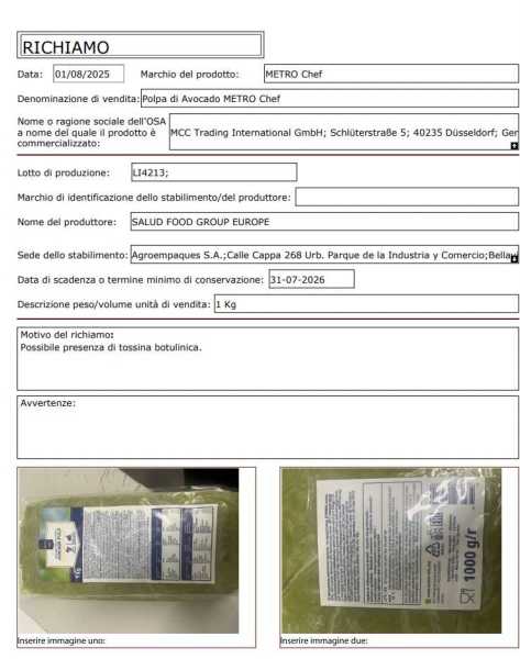 Intanto il ministero della Salute ha disposto un richiamo in via precauzionale per la polpa di avocado Metro Chef, prodotta da Salud Food Group Europe, per "possibile presenza di tossina botulinica", si legge nel comunicato ufficiale. La salsa è venduta in buste di plastica da 1 chilo nei 40 centri della catena all'ingrosso "Metro".