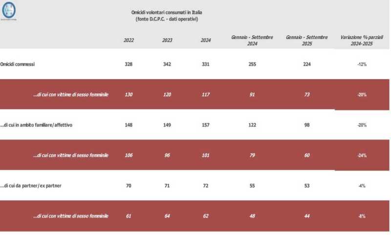 CAGLIARI. Sono 224 gli omicidi commessi in Italia tra il 1 gennaio e il 30 settembre del 2025. In calo del 12% rispetto all'anno scorso, quando il bilancio era di 255. È quanto emerge dal report della direzione centrale della Polizia criminale pubblicato oggi.