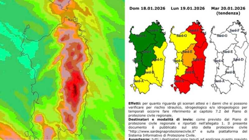 CAGLIARI. Allerta meteo rossa per l’arrivo di piogge abbondanti, venti di burrasca e mareggiate che si abbatteranno nelle prossime ore su gran parte della Sardegna. La Protezione Civile regionale ha emesso un avviso di criticità elevata a partire dalle 21 di oggi e fino alle 23.59 di domani, lunedì 19 gennaio, per rischio idrogeologico. Il livello di allerta massimo riguarda i territori di Iglesiente, Campidano, Flumendosa-Flumineddu e Gallura. Sarà arancione invece per la zona del Tirso e gialla per le restanti.