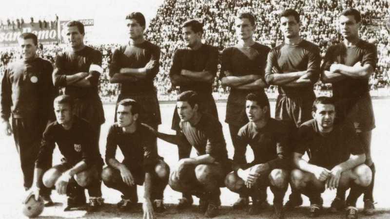 Il Cagliari del campionato 1963/64: Spinosi è il secondo in alto da sinistra con la fascia da capitano (il quinto da sinistra è Gigi Riva)