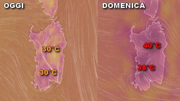 Se oggi le temperature raggiungeranno la soglia dei 30°C solo in localizzate aree della Nurra, della piana di Ottana, dell'Oristanese e del Medio Campidano, domenica il discorso sarà ben diverso. Sul Sulcis Iglesiente, medio alto Campidano, Oristanese, Nuorese e Sassarese si salirà diffusamente oltre i 35°C con picchi fino a 40°C attesi nelle vallate più interne. Calura (soprattutto afa in virtù dell'aumento dei tassi di umidità) che si farà sentire anche nei tratti costieri. Qui si passerà dagli attuali e freschi 25°C/27°C ai 28°C/32°C di domenica con picchi fino a 33°C/34°C sui litorali occidentali.
