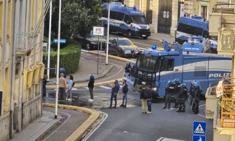 Sorvola la zona un elicottero. Massiccio il dispiegamento di forze dell'ordine in città, con agenti in tenuta antisommossa e, appunto, il mezzo idrante della polizia, per scongiurare scontri tra i due gruppi di manifestanti.